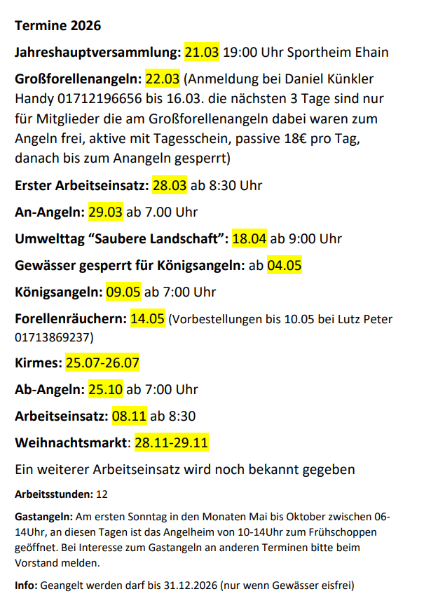 Großforellenangeln: 22.03 (Anmeldung bei Daniel Künkler Handy 01712196656 bis 16.03. die nächsten 3 Tage sind nur für Mitglieder die am Großforellenangeln dabei waren zum Angeln frei, aktive mit Tagesschein, passive 18€ pro Tag, danach bis zum Anangeln gesperrt)